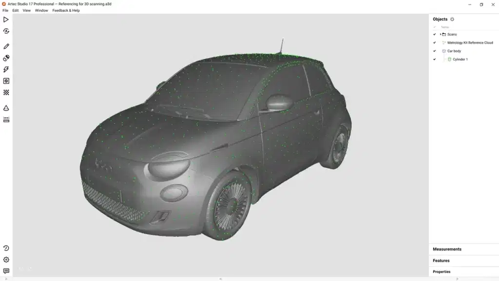 Metroloji Kiti, bağımsız bir optik ölçüm çözümü olarak veya mesafeye göre daha yüksek 3B tarama doğruluğu için bir referans aracı olarak çalışabilir. Metroloji Kiti eklentisini kullanarak, tüm 3D tarama + fotogrametri iş akışını doğrudan Artec Studio’nun içinde elde edersiniz.